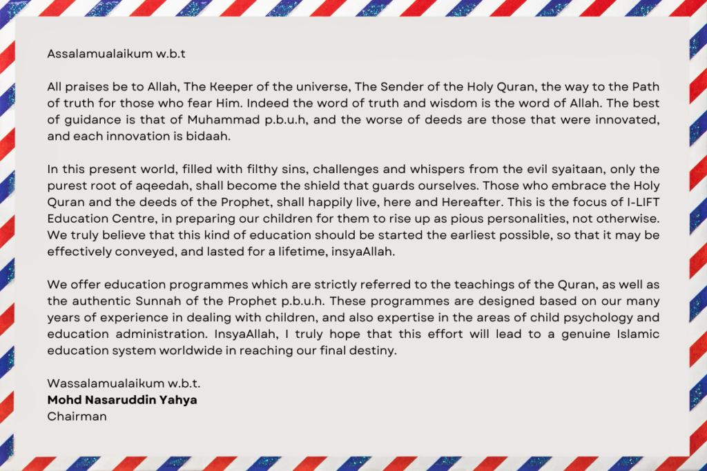 Generating an educated ummah through our I-LIFT Education Program, that fosters an excellent understanding and practice of Islamic principles that adhered to Al-Quran and As-Sunnah in accordance to the understanding of Salafussoleh, at the very early age, together with an outstanding academic achievement, which promote a practical balanced spiritual, intellectual and emotional development of Islamic personality.